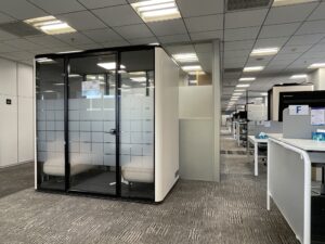 - Meeting pods come in different sizes and offer improved acoustics for group discussions.